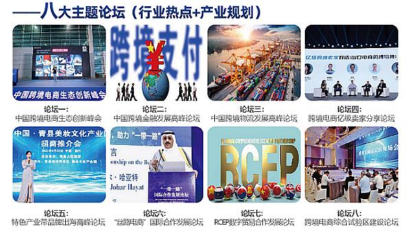 此次展會將以“擁抱數字經濟,賦能產業集群;掘金跨境電商·助力品牌出海”為主題,旨在為跨境電商平臺、服務商 及外貿企業、采購商提供品牌展示、貿易洽談、采購對接、資源共享為一體的高端交流合作平臺。此次展會共設置“八大 特色展區”,開設“八大主題論壇”,開展“八大特色活動”,為展商提供“八大尊享福利”,為推動我國跨境電商高質量發展,群策全力、貢獻力量。