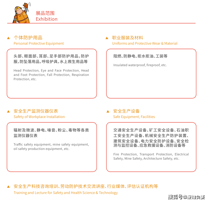 展品類別 :頭部防護、面部防護、眼部防護、聽力防護、呼吸道防護、手部防護、足部防護、身軀防護、高空安全防護、監測檢驗監測設備、安全警示及相關防護設備、產品認證、安全培訓等勞動保護、防疫防護、應急救援相關產品。