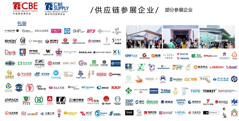 科絲美詩、瑩特麗、日本科瑪、韓國科瑪、COSMOBEAUTY、諾斯貝爾、伊斯佳、棟方、芭薇等OEM/ODM企業;HCP、阿克希龍、阿蓓亞、洽興、益發、新奎、喬藝、通產麗星、愛索爾等包裝企業;布魯克納、VETRACO、LEIDEX、JOOSHING柱信機械、PRIMIX、全馳、科瑞特、誠興、輕工、日高等機械設備企業;銘康、芬豪、焦點福瑞達、仙萃生物等原料企業;SGS、微譜、廣東博溪、北京頤唯實等檢驗檢測企業……