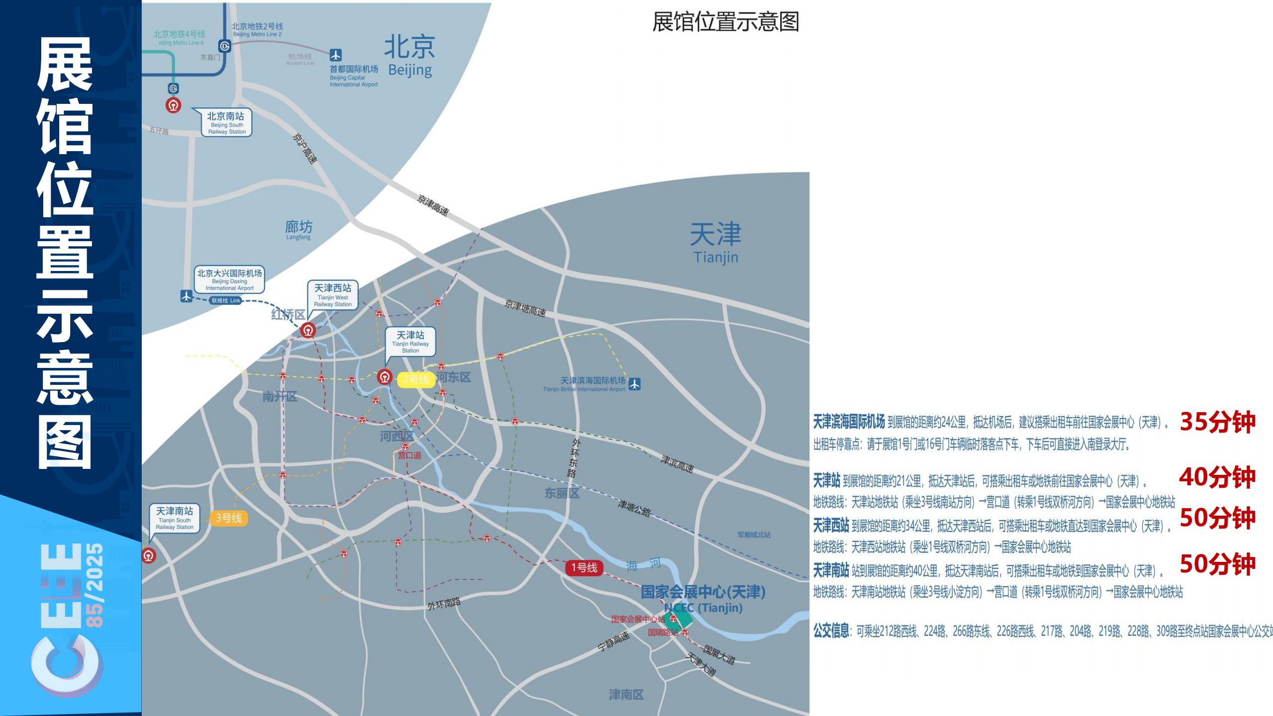 天津擁有一個國際機場和四個火車站,其中天津濱海國際機場距天津市中心13公里,火車站主要使用天津站、天津西站和天津南站,其中南站是動車高鐵站,天津北站基本沒有客運業(yè)務。天津國家會展中心及主會場酒店距離天津濱海國際機場約24公里,天津站約21公里、天津西站約34公里、天津南站約40公里,地鐵一號線從以上三個火車站均能直達展館。