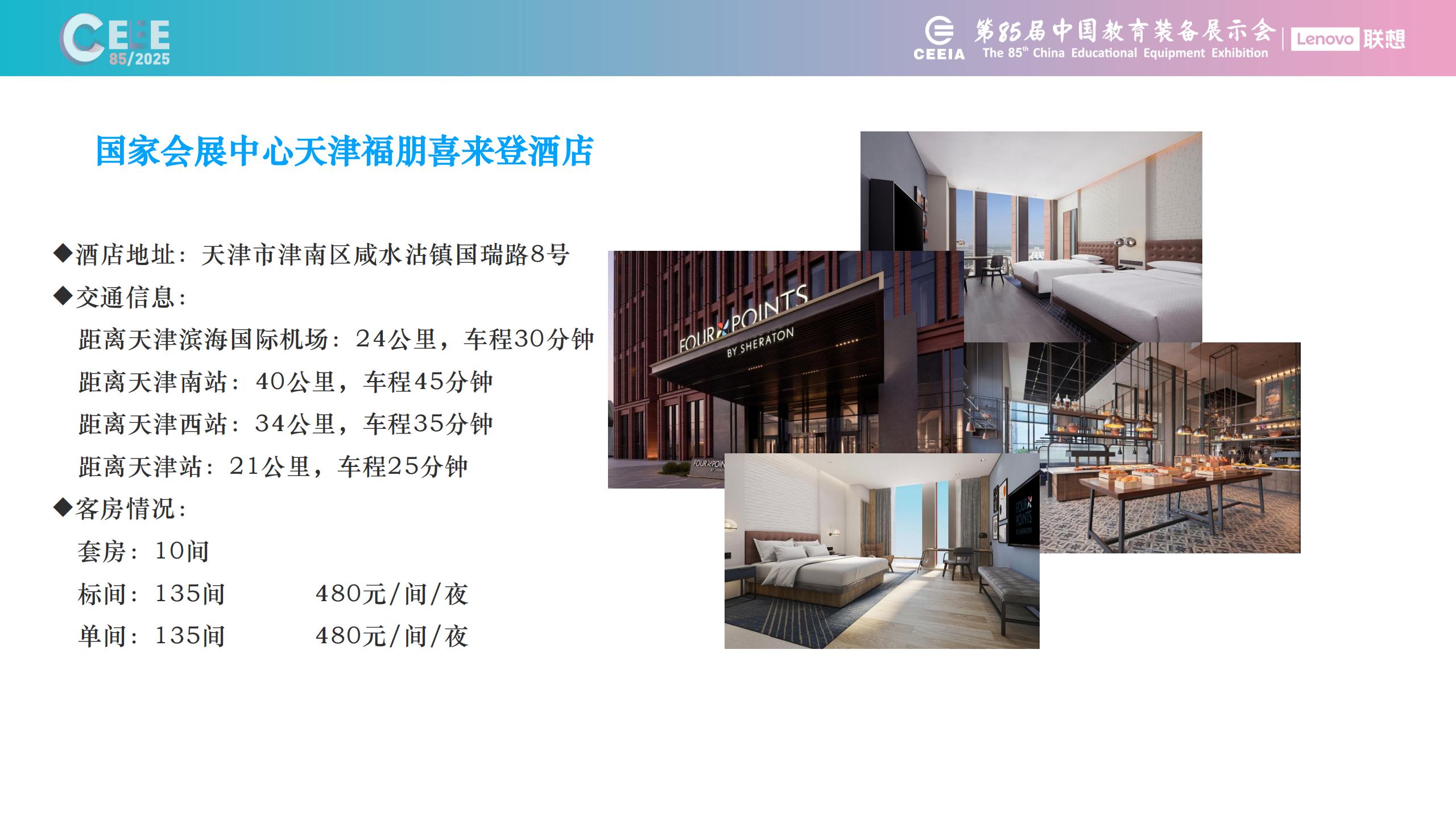 第85屆中國教育裝備展示會的主會場為國家會展中心天津福朋喜來登酒店和國家會展中心天津萬豪酒店。酒店毗鄰國家會展中心,兩家酒店在展示會期間總計提供430間客房,其中標間235間,單間185間,套房20間。