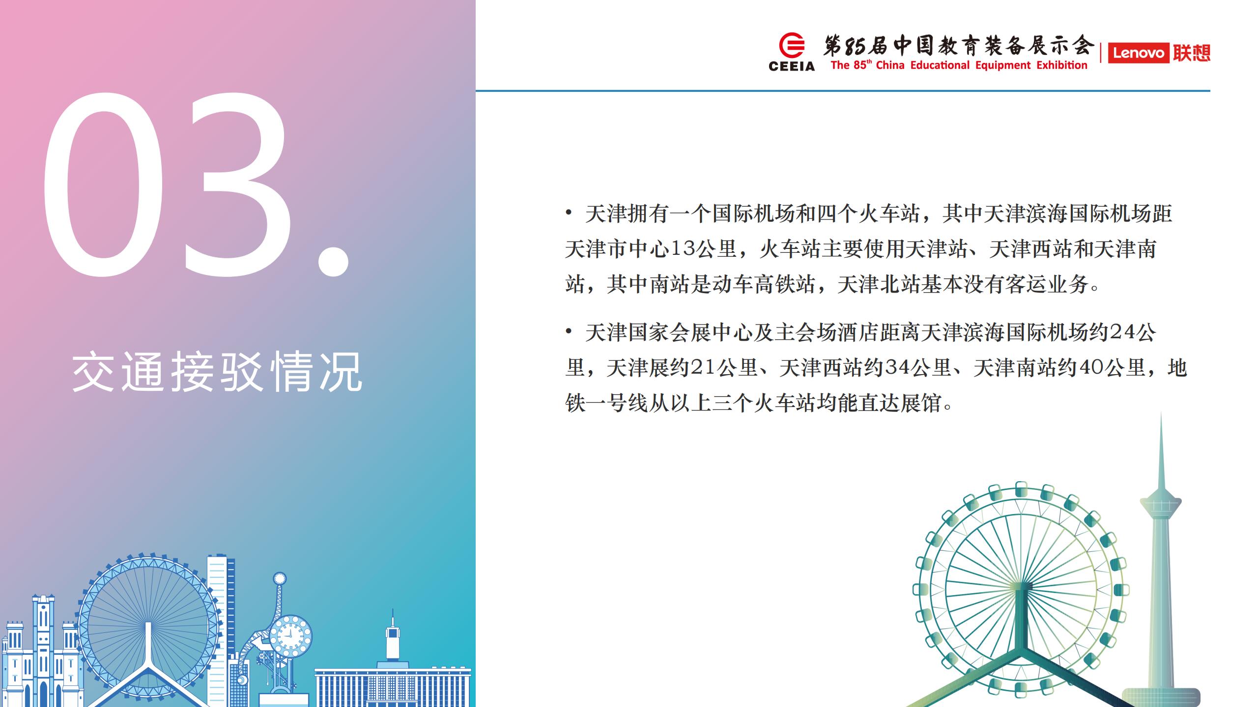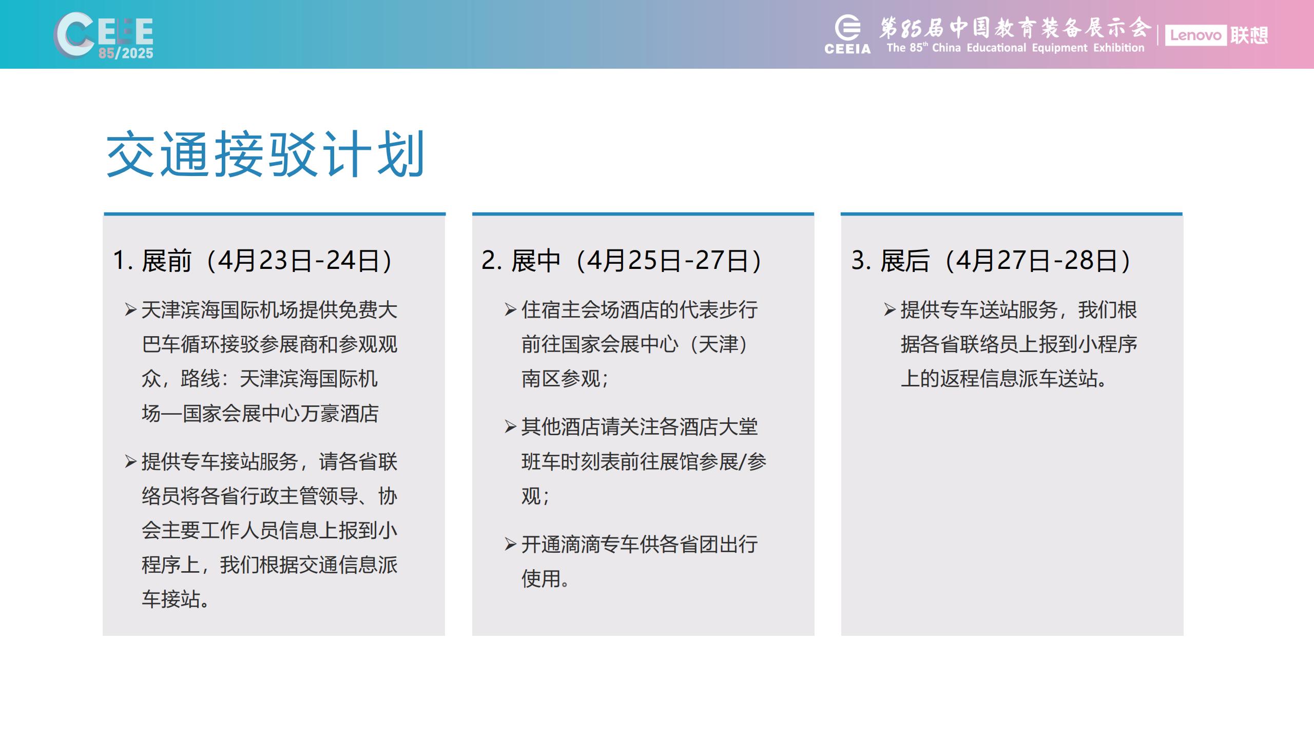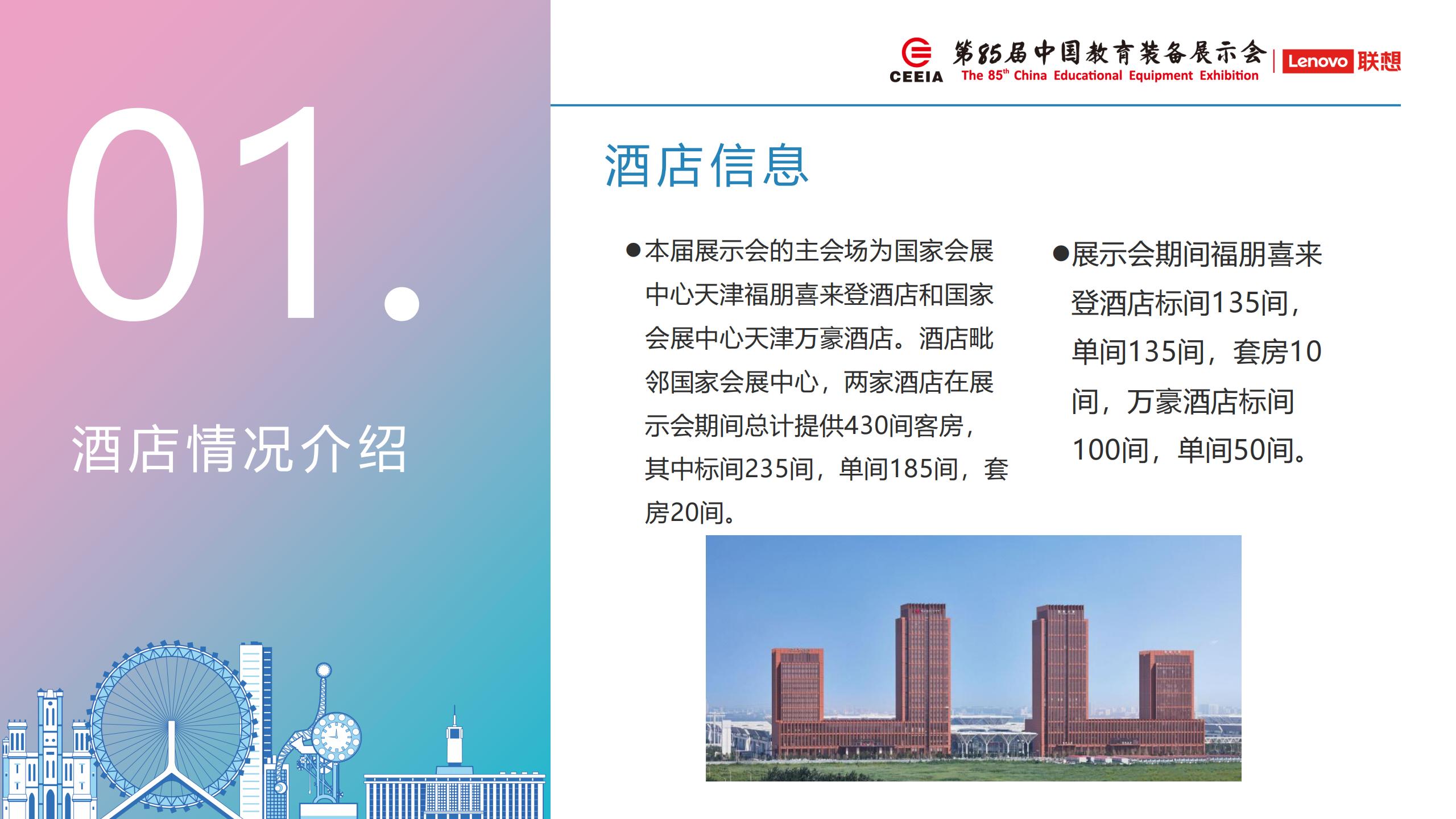 第85屆中國教育裝備展示會再次回到天津,對于會務接待工作的壓力非常巨大。我們將全力以赴做好主會場酒店的接待服務工作,細化接待服務工作,完善服務內(nèi)容,另外針對參展商的酒店預定工作我們安排如下調(diào)整:1、提供兩家會務服務商的酒店預定清單(青島左格會展/北京中悅國際);2、提供每日接駁班車往返各駐會酒店和展館;3、保證各省團行政領(lǐng)導、各省協(xié)會主要人員住宿主會場酒店。