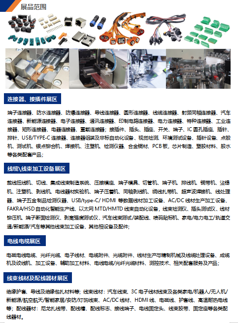 端子連接器、防水連接器、防爆連接器、導(dǎo)線連接器、圓形連接器、線纜連接器、射頻同軸連接器、汽車連接器、新能源連接器、電子連接器、通訊連接器、印制電路連接器、電力連接器、特種連接器、工業(yè)連接器、矩形連接器、電腦連接器、重載連接器;接插件、插頭、插座、開關(guān)、端子、IC圓孔插座、插針、排針、USB/TYPE - C連接器、連接器組裝及非標(biāo)自動化設(shè)備、視覺檢測、環(huán)境測試設(shè)備、插針設(shè)備、點(diǎn)膠機(jī)、測試機(jī)、銀點(diǎn)鉚合機(jī)、焊接機(jī)、注塑機(jī)、檢測儀器、合金鋼材、PCB板、芯片制造、塑膠材料、膠水等各類配套產(chǎn)品;