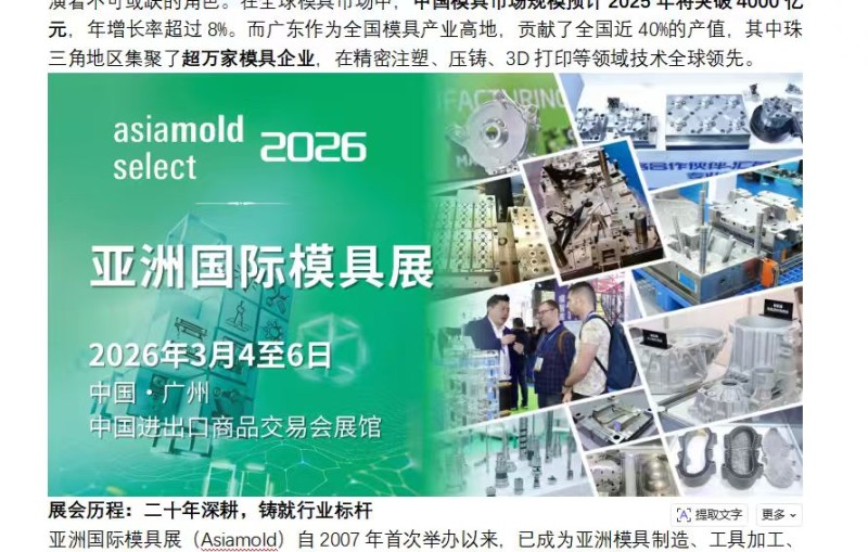 2026年3月4日至6日,讓我們相約廣州進(jìn)出口商品交易會(huì)展館,共同見證亞洲模具展二十周年的輝煌時(shí)刻,攜手開拓模具產(chǎn)業(yè)的新藍(lán)海。