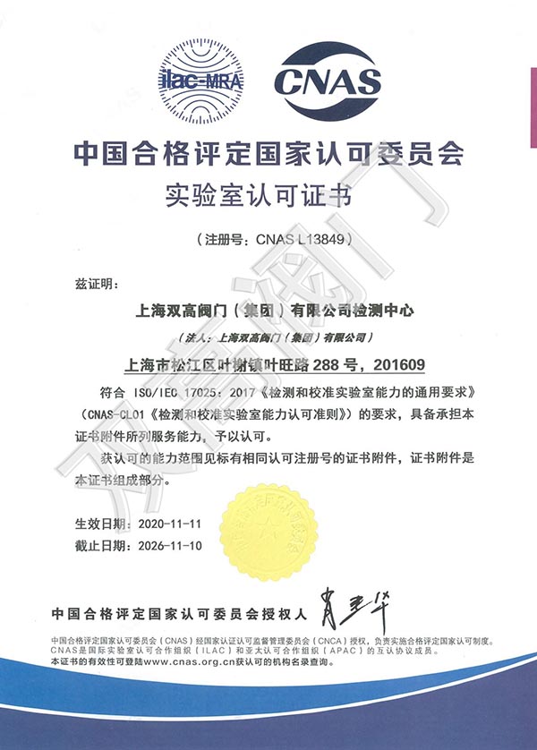 雙高閥門檢測中心成功獲得中國合格評定國家認可委員會(CNAS)認證